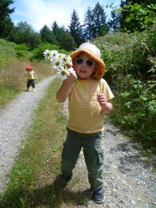 What can you do? Such is the way of things. The rest of the day was much better. I got all the bedding in the house washed, we took a stroll in our hood looking for daisies so that we could attempt this, we busted out the water table when the thermometer reached 70°, and I made some strawberry freezer jam from a $5 flat of strawberries Husband surprised me with yesterday.