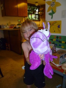 Cody’s favorite stuffed animal, hands down, is a purple and white stuffed shrimp whom he named Kissy Shrimp. I bought the shrimp during a mad purchasing flurry of underwater-sea life themed items for his bedroom when we finally moved the crib out of our room and into his very own. I found it at a local thrift store, took it home, washed it, and he has been attached to it ever since. That was about four years ago. He has other stuffed animals that are near and dear to his heart. Tom, is a five foot long crocodile who wears a blue and white poka dot shirt. He tends to get used more as a fire hose these days and less as an actual crocodile. There is also a parrot with a multi colored tail and an armadillo named Arnold.