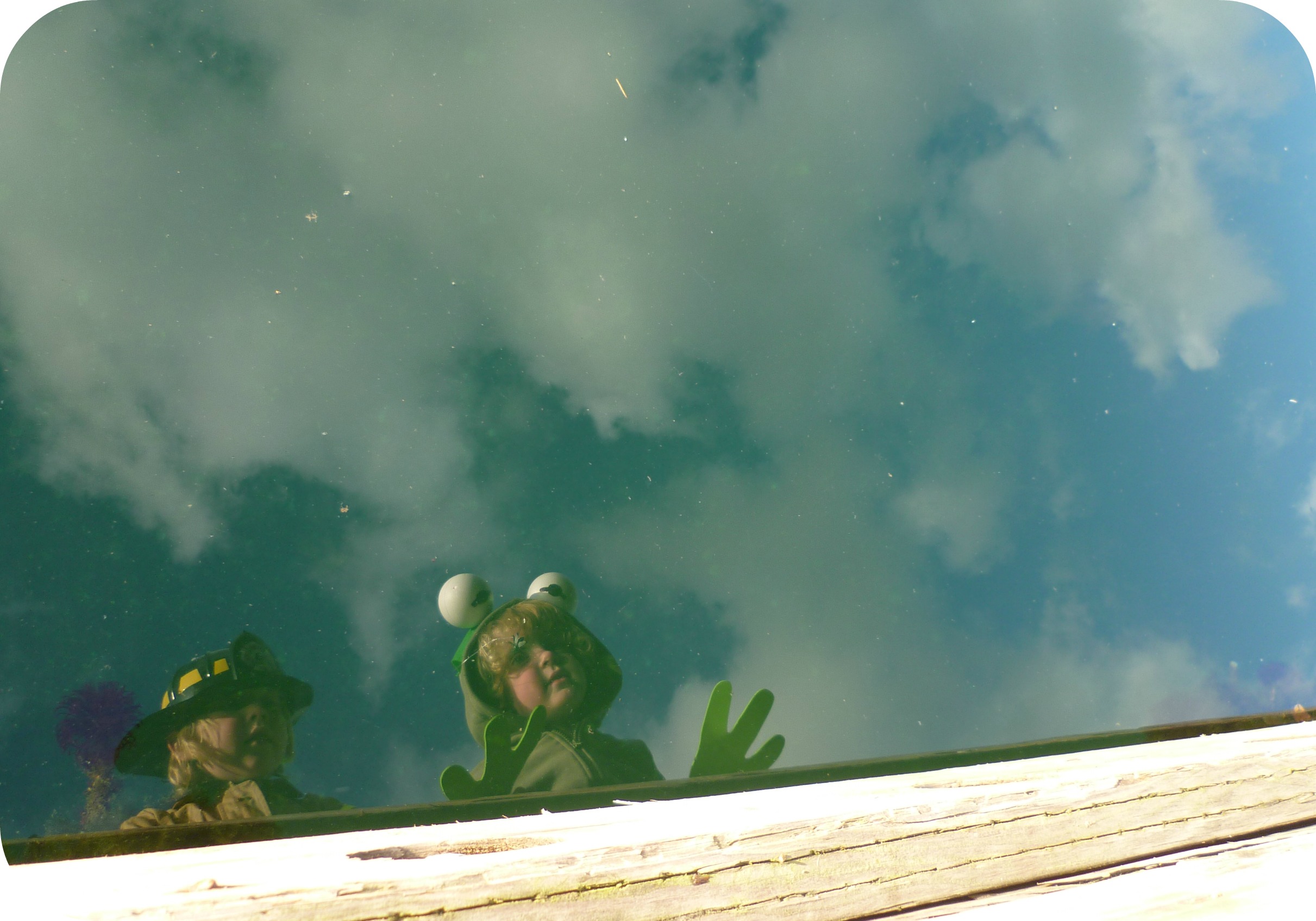 They were looking at little jellyfish in the water and so I leaned over with them, saw that image, and just started taking pictures. It took me a couple tries to get my reflection far enough to the side that I only had to crop a little bit. The purple sea pen next to Cody was an added bonus. And it was super nice that no one fell into the drink! 🙂