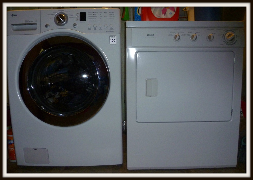On the left you have our LG washer, Lola aptly named from the movie Run Lola Run, because she is always running. To the right is her sidekick Ken the Kenmore dryer.