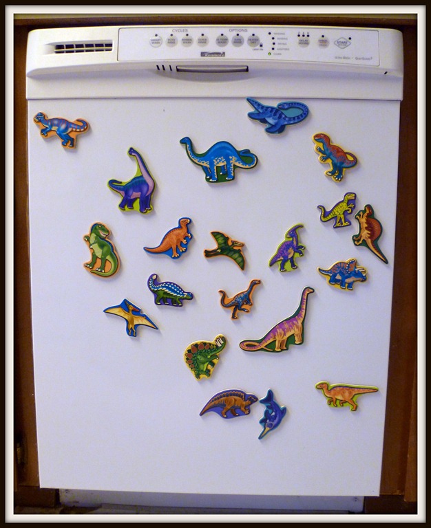 Here you have a nice shot of Porcupine our dishwasher covered with dinosaur magnets. Cody named him Porcupine due to the numerous pokey things on the top and bottom rack that hold your dishes up.
