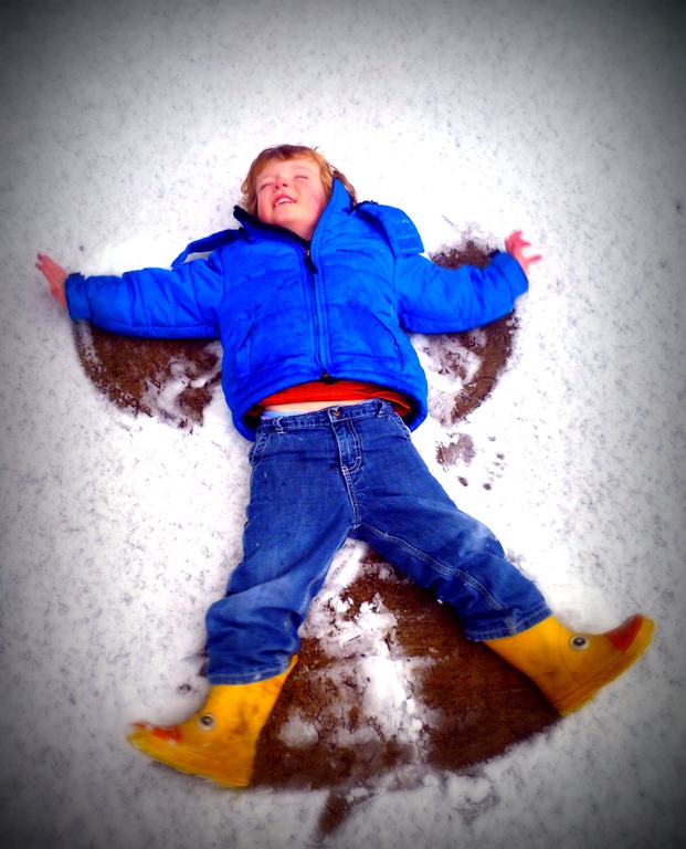 I am so glad I paused from making lunch and peeked out the window. I grabbed my camera, ran out the door, and he showed me his snow angel making techniques as well as pointing out all his little footprints in the snow. I don’t think he remembers snow from last year so he was very thrilled. πŸ™‚