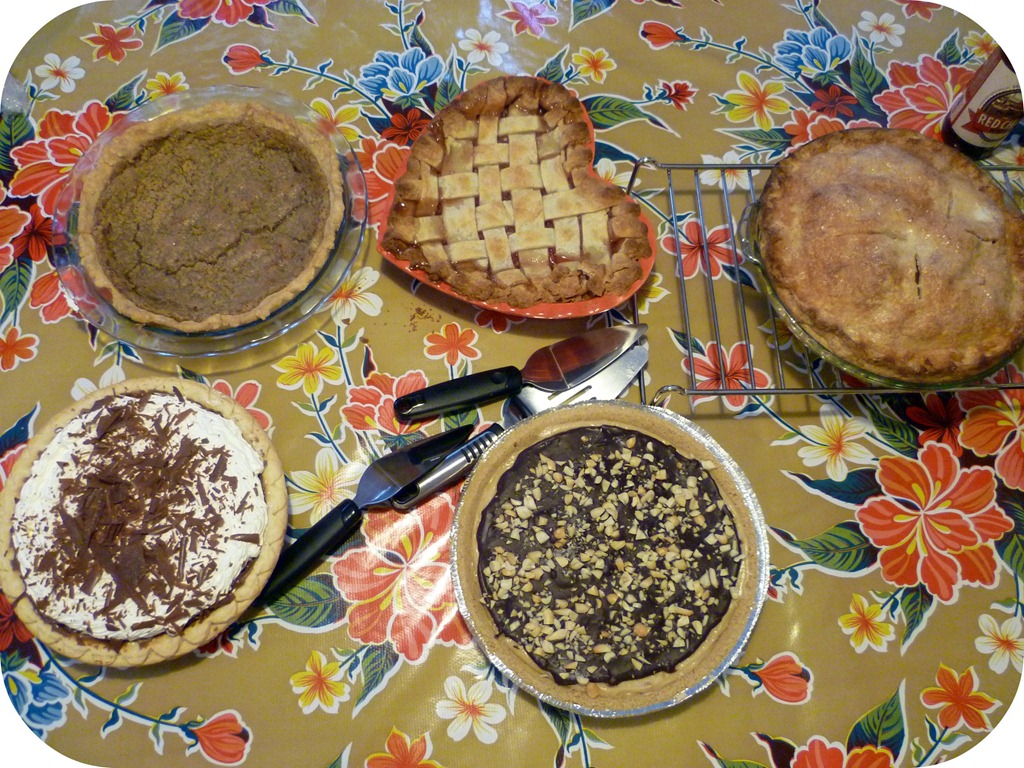 It was a smashing success. We ate lupper, or linner if you prefer, around two and then brewed some coffee and stared down the pack of pies upon the table. The line up was as follows: Sugar Pie (made by yours truly), Peanut Butter Chocolate Pie (Husband’s creation), Apple Pie, Red Huckleberry Apple Pie, and a Chocolate French Silk Pie. They were all homemade except for the last one and were all quite good. There was also the obligatory vanilla ice cream and some cookie and cream ice cream as well although I prefer to fill up on pie, thank you very much. Besides ice cream makes pie crust soggy, yuck! The kids played in the the back bedrooms, dumping out all the toys and making a huge mess but leaving us adults to our pie so the clean up was well worth the peace and pie.