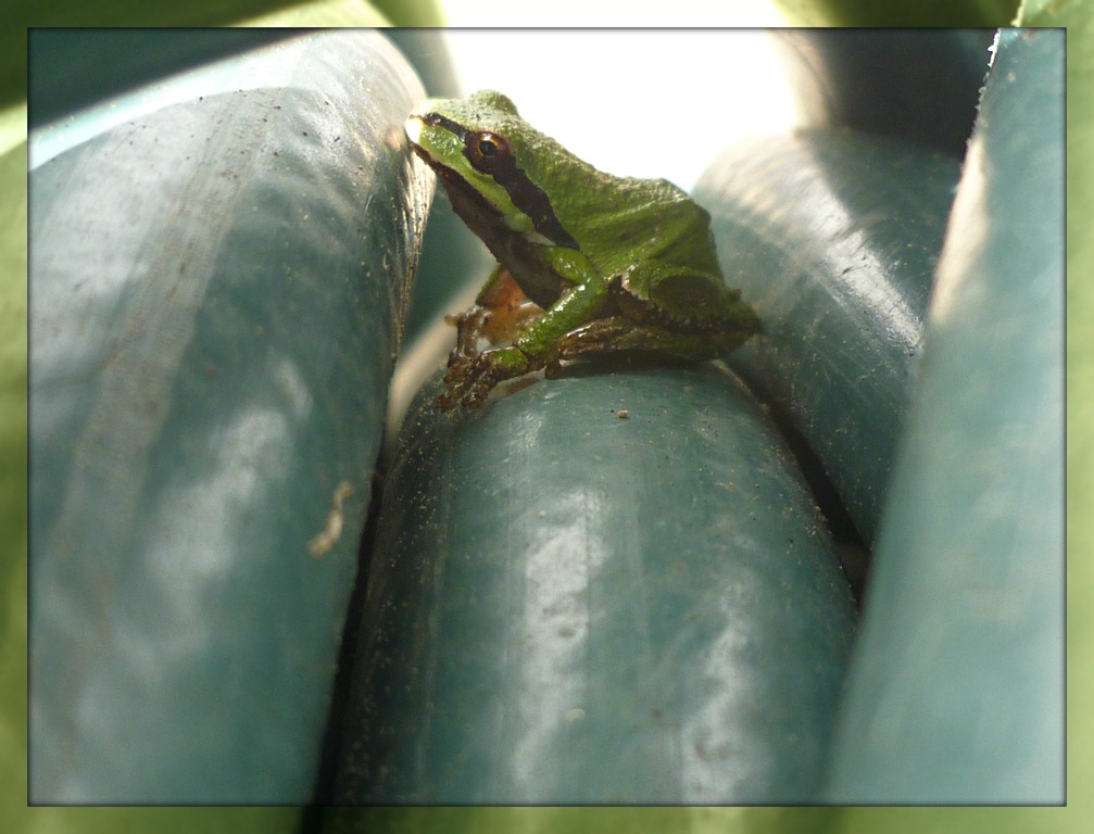 Our resident hose frog has returned, claiming our coiled hose as its home. This is at least the fourth year we have had a hose frog and since we named the first one Hoser, we call this frog Hoser the Fourth. I never said we were creative in our naming of things.