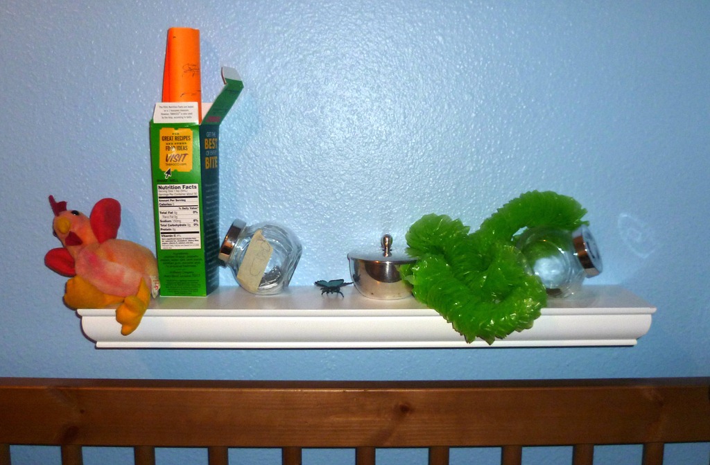 Interesting how Cody’s shelf is more containerized than Carter’s. On my shelf, I would put the small things from my nightstand that Jason is now beginning to reach – a glass paperweight from my parents, my kindle, the chapter book that Laura and I are reading together. This reminds me that Laura’s shelf is still packed from our move waiting to be put up once her room is finally painted. In the past, the shelf held her piggy bank and crown collection.