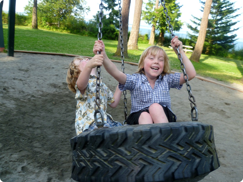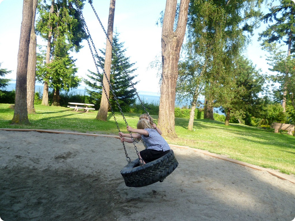 I have fond memories of tire swings. My dad put one up in our front lawn where we waited for the school bus. My sister and I clocked many an hour on that swing.