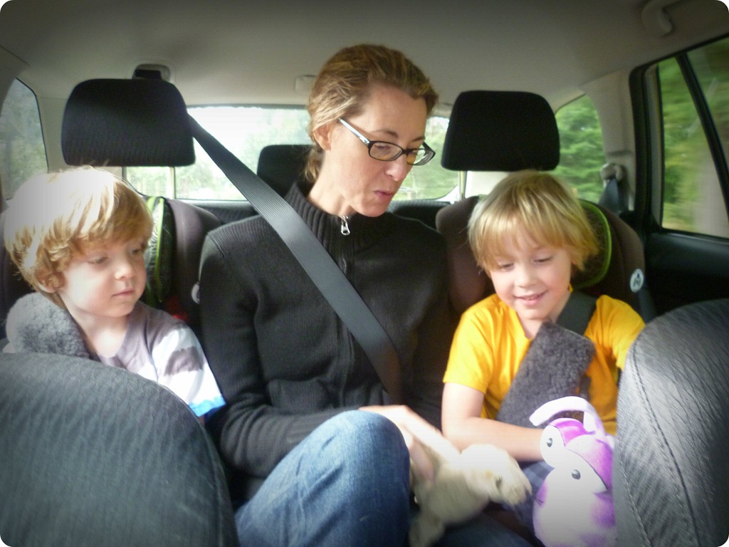 Our friend, Simone, made for a great travel companion. She fits between the two car seats, no easy feat, thereby making a human blockade greatly limiting the amount of fighting the boys could carry out during our travels. The boys were very smitten with her especially since she had brought them each a stuffed animal sea lion as a gift, one of which she used as a puppet to talk to Cody’s Kissy Shrimp, using what I can only imagine was the perfect sea lion voice if a sea lion were to speak English. I did take pity on her part way through the trip and we traded places for a while. The rest of the time I enjoyed not being the center of my children’s world and pretended that Simone really liked being mauled by two overzealous little boys.