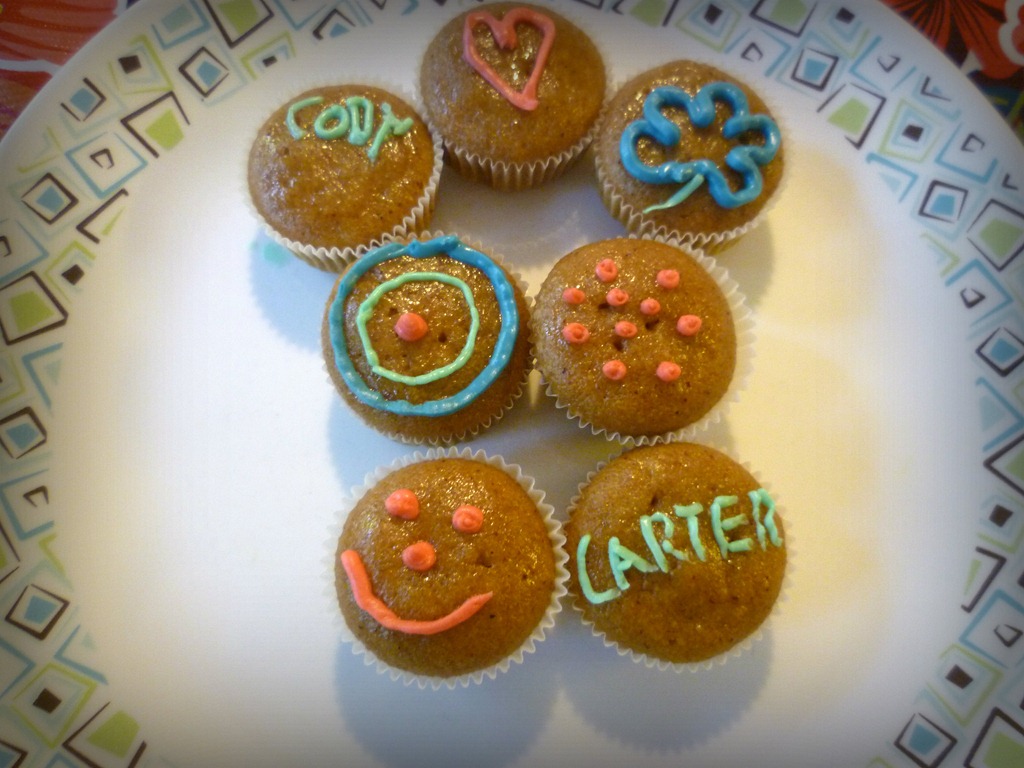So today I made mini math themed pumpkin muffins for the party.  I have never done anything that even closely resembles frosting decorating but I think they turned out nicely.