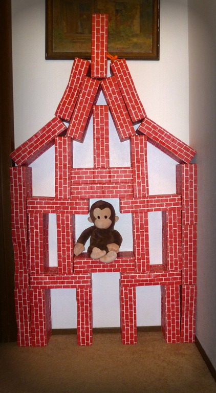 Orange skeleton precariously placed on the right at the top…Curious George safely ensconced in his castle and an example of impressive construction!!