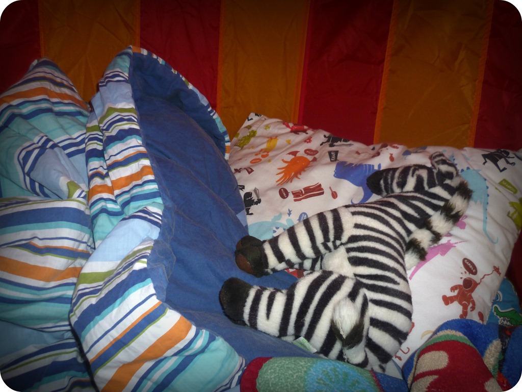 Night two:  Carter once again wanted to sleep in the circus tent.  We talked about how he was not to wake me.  If he wanted to move to his bed he could do so on his own.  I gave him a comforter to keep him warm and tucked him in. Once again Husband and I peeked in on the boys to find an angelic Carter snoring away, perhaps dreaming happy cotton candy circus dreams. In the wee hours of the morning I heard the cry – momma, Momma, MOMMA. This time the comforter had fallen off one of his legs and he was just too tired to reach over and fix it. I think I said something along the lines that he could either wake up enough to fix it himself or sleep with one cold leg before I huffed back to my bed.