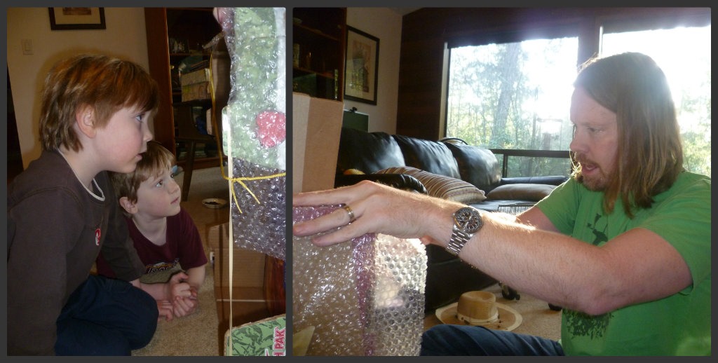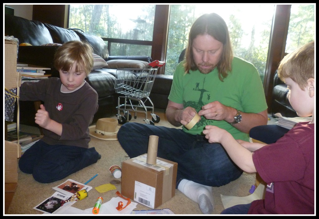 The body of the bot was a box from Costco, one of those they put all your items in to make it easier to carry. Carter wanted rocket boosters, i.e. toilet paper rolls, attached to the back of the robot so Husband carefully cut some slits in the box while the boys supervised.