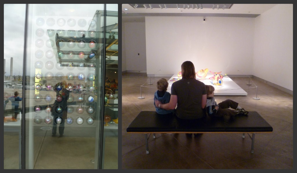 Here is Cody running towards the front entrance of the glass museum with Husband trying to keep up. It was this energy (times two, when you consider Carter) that had me worried about setting foot in the Museum of Glass.