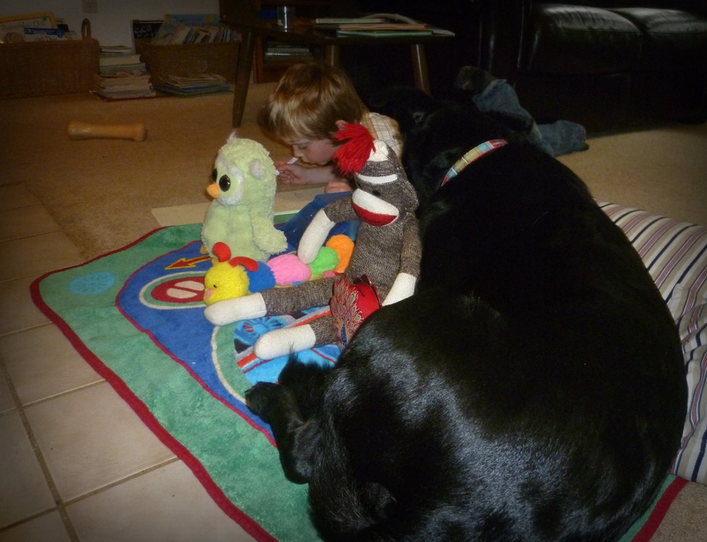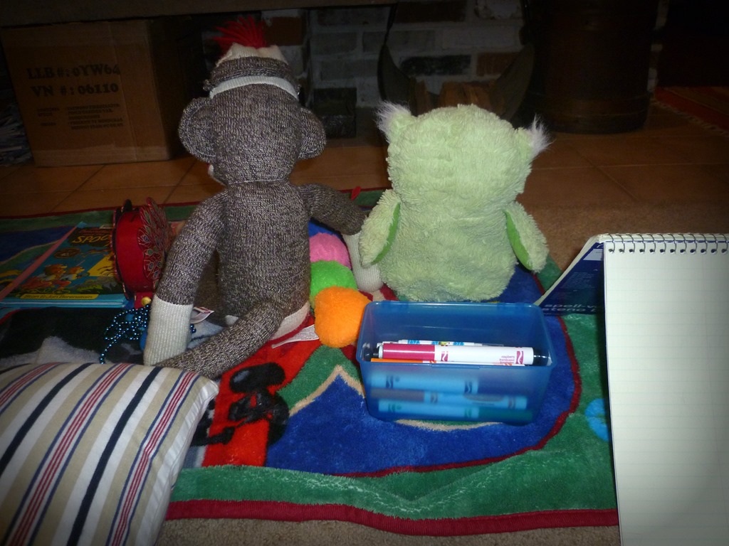 While they were gone, Carter and I decided it would be nice to have a fire in our fireplace, the first one of the season.  To celebrate this, for Carter is always looking for an excuse to celebrate and have a party, he laid out his Thomas the Train blanket in front of the fireplace and invited some stuffed animals.  He supplied them with markers, a pad of papers, and some musical instruments.