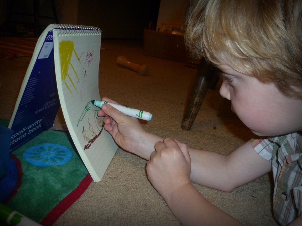 Carter’s attention then drifted over to the sketch pad and markers, delighted that he could stand up the sketch pad to make a mini easel.  We worked together on drawing a pumpkin patch.  I drew the orange pumpkins and yellow sun, Carter did the rest.