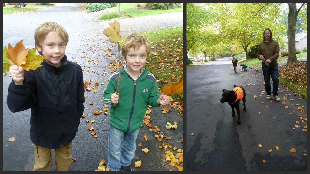 Yesterday we went for a walk in the neighborhood.  The boys collected leaves and Haley tried out her spiffy new reflective vest that she will now wear when her and Husband go out for their early morning jogs.