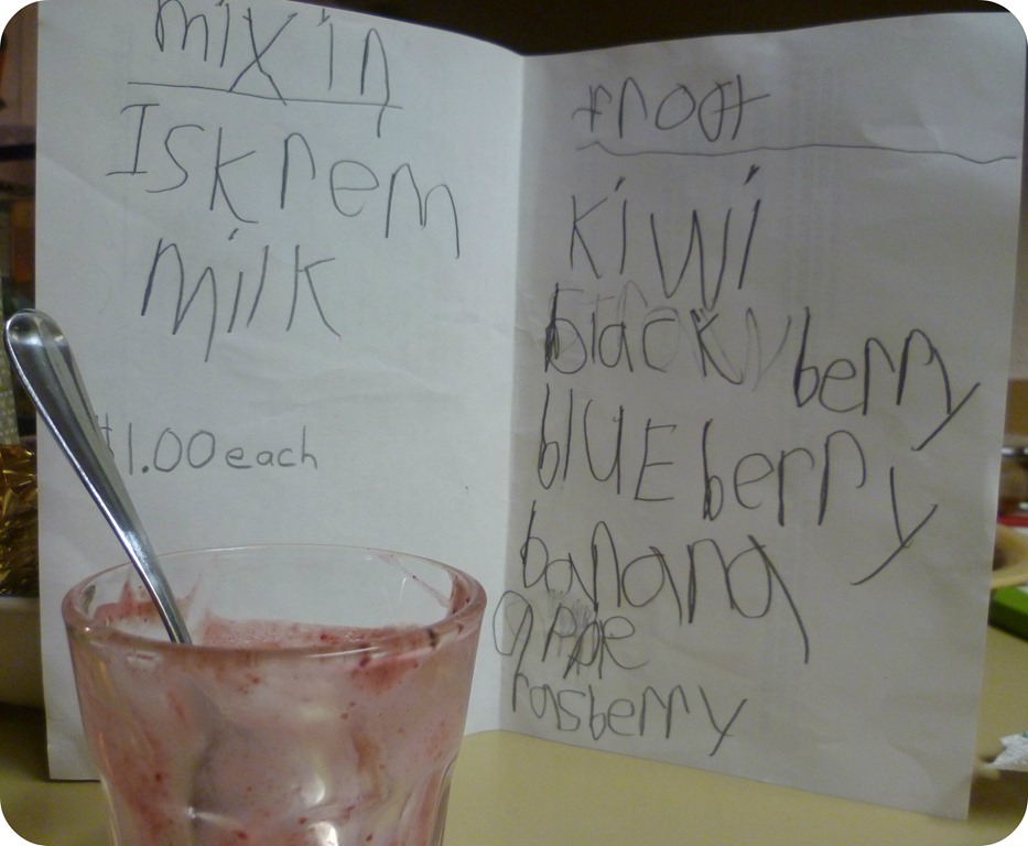 When Husband got home from work, he was greeted by this welcoming sign and two boys eager to seat him at the dining room table. Hardly had he a chance to put his keys down and have a seat, but a menu was thrust into his hand and he was told to order a smoothie.