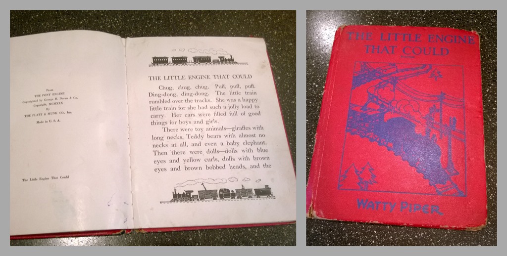 Being a first year teacher is hard.  To compound things I am, as you know, a mother to two boys.  We also just moved to Arizona from Washington and Husband is currently very busy helping his aged father gracefully navigate the state of befuddlement he is rapidly descending into. Life is very challenging for me right now and if I stop to think about it all, or even focus on just a tiny corner, tears spring to my eyes.  I feel I need to work harder, do better at, be better in almost all areas.  I am tired and my mind spent when I get home from teaching everyday.  I am struggling to stay one day ahead. And so on the weekends, I wake up early.  I get dressed, laced up my shoes, and tiptoe out the door with Haley, our dog, happily tugging at the leash.  Most mornings I get out alone (well, me and Haley get out alone).  Sometimes Cody wakes up and wants to join us creating an entirely different walking dynamic. This morning it was just Haley and I.  We walked for almost an hour.  The city woke up around us.  The pieces of my mind that I felt I lost during the week, slowly returned to me with each passing step.  But that was not all I found on my walk this morning. I found three quarters and two pennies.  Not a bad find for a morning walk. But it gets better.  As Haley and I rounded a corner in a quiet neighborhood I spied a rather beat up looking thin red book lying face down where the road’s edge met up with some tuffs of struggling grass.  I am a book lover and so naturally I picked it up.  And turned it over. The Little Engine That Could Collage One of my favorite children’s books and one that holds great meaning for me.  Shortly after Cody was born, during the time he was in the hospital struggling to grow and survive, a friend of ours gave him a small version of The Little Engine That Could.  Symbolism. It is not in the greatest of shape, but not too shabby for a first edition 1930 hardbound book that was just lying there by the side of the road. The Little Engine That Could Page Little pieces of my mind, 77 cents, and The Little Engine That Could – all on a Saturday morning walk.