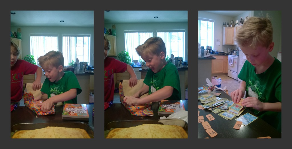 My baby boy turned seven today. We had a very low key celebration, for both him and I. A simple day that started with a morning dog walk from which we came home to find Husband had cooked us all breakfast. Carter opened some gifts (the 100 pack of Pokémon cards and the four pack of Minecraft books were the favorites).