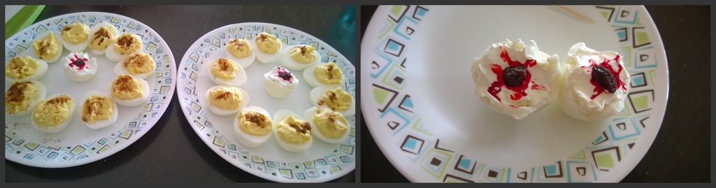 Holding true to our made-up holiday tradition, there were deviled eggs. Carter added a bit of flare this year by making a pair of cream cheese, raison pupil, bloodshot egg eyes. And really, why wouldn’t you?