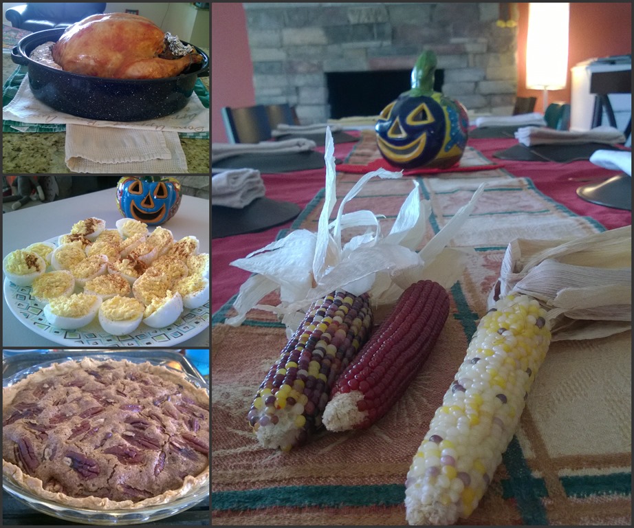 The turkey, deviled eggs, and my first attempt at pecan pie. I love the small decorative corn cobs and was surprised the kittens did not like them as much as I did.