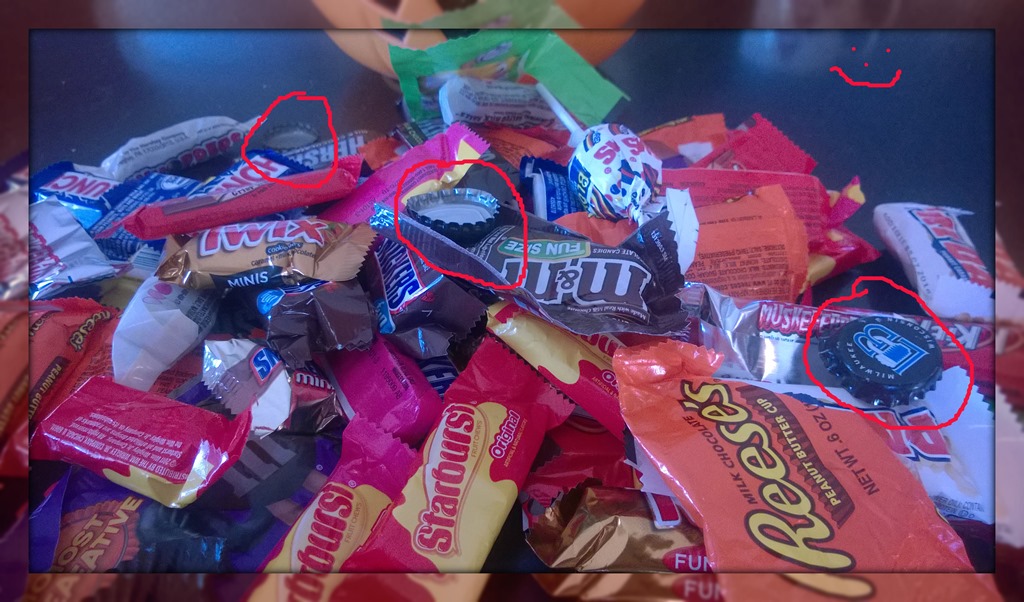 This is the loot Cody came home with after a long night of trick or treating with his brother and Husband. Do you see three things that are not like the others?