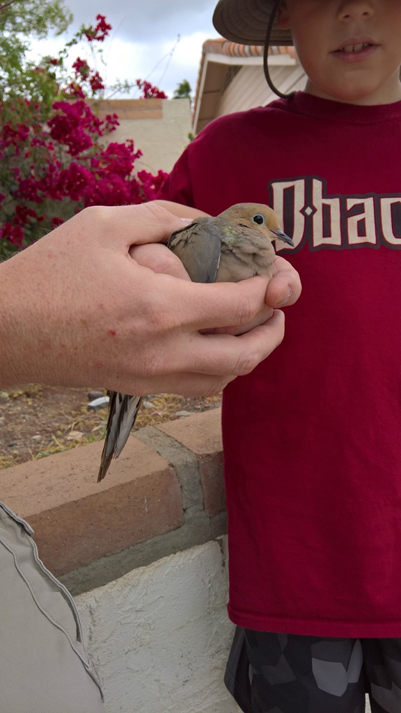 Apparently the poor bird had become entangled in some discarded fishing line (there are a couple ponds in the park, in case you were wondering why there was fishing line in the middle of Phoenix). The fishing line was wrapped around her neck and each end was caught in the bush, leaving her to wildly flap but get no where. Awful! It took a few tries but Husband was able to catch her and untangle the line from the bush. He could not get the line, however, undone from her neck.