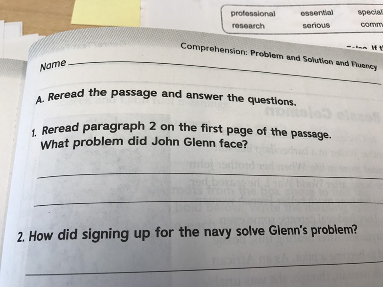 Today in class my students partner read a passage about John Glenn and then answered questions involving problems and solutions.