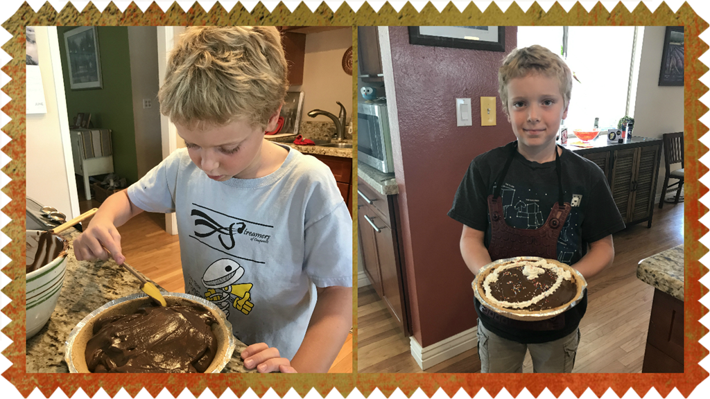The boys participated in Summer Pie Day as well. Carter, who usually makes chocolate pudding (not at all a pie), made his pudding but asked to put it in a graham cracker crust. For added flair, he topped it with whipping cream and sprinkles.