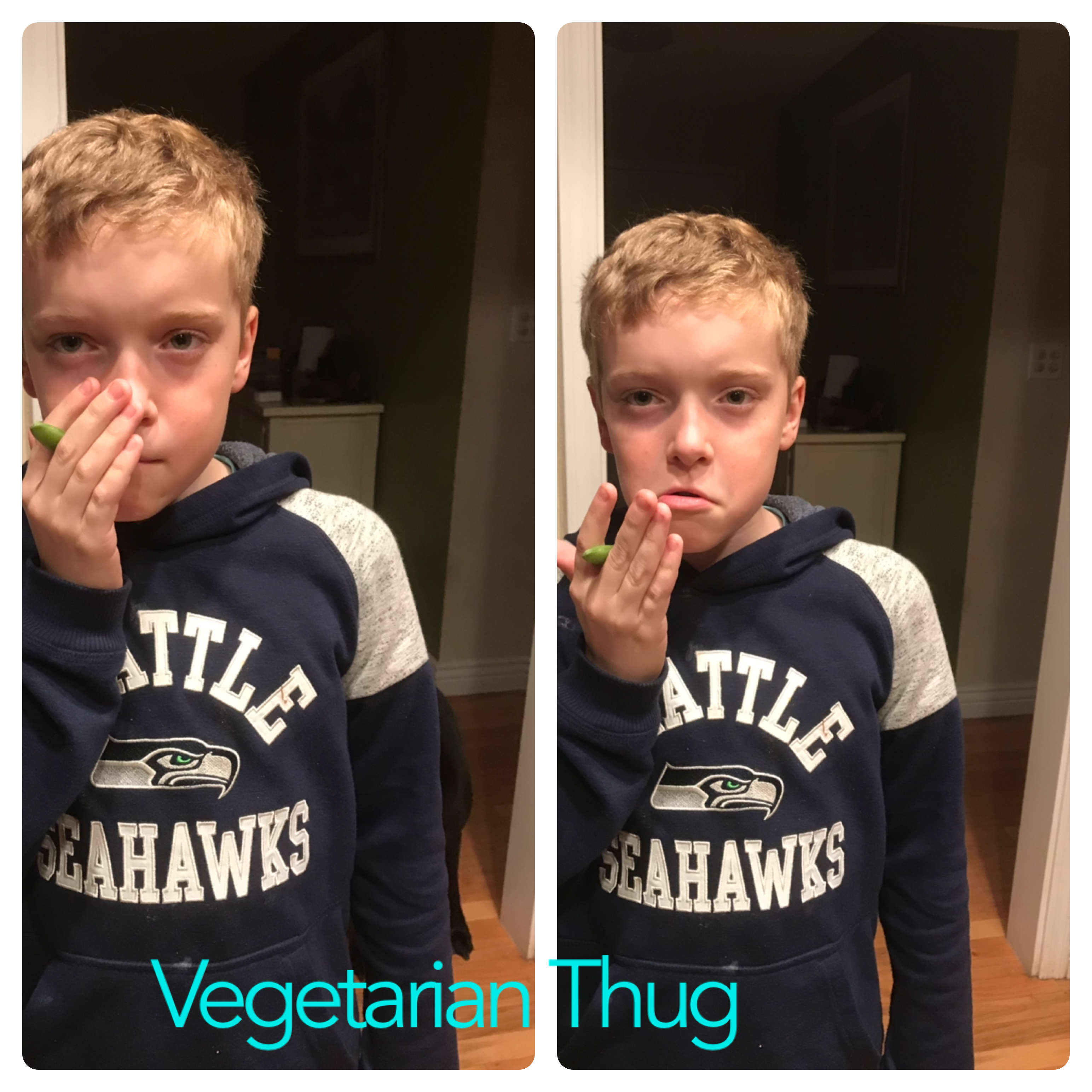 Carter helped himself to another fistful of peas. He called out for me to look at him. There he was jauntily leaning against the kitchen door frame, pea pod held between his fingers as if it were a cigarette. His face was puckered into a scowl, his eyes narrowed and dark. Then he smiled and laughed as he proclaimed himself to be a Vegetarian Thug. The Veggie Thug took a pea puff or two and then chomped off the end of his prop and smiled again. I asked him to recreate his Thug so as to photograph it.