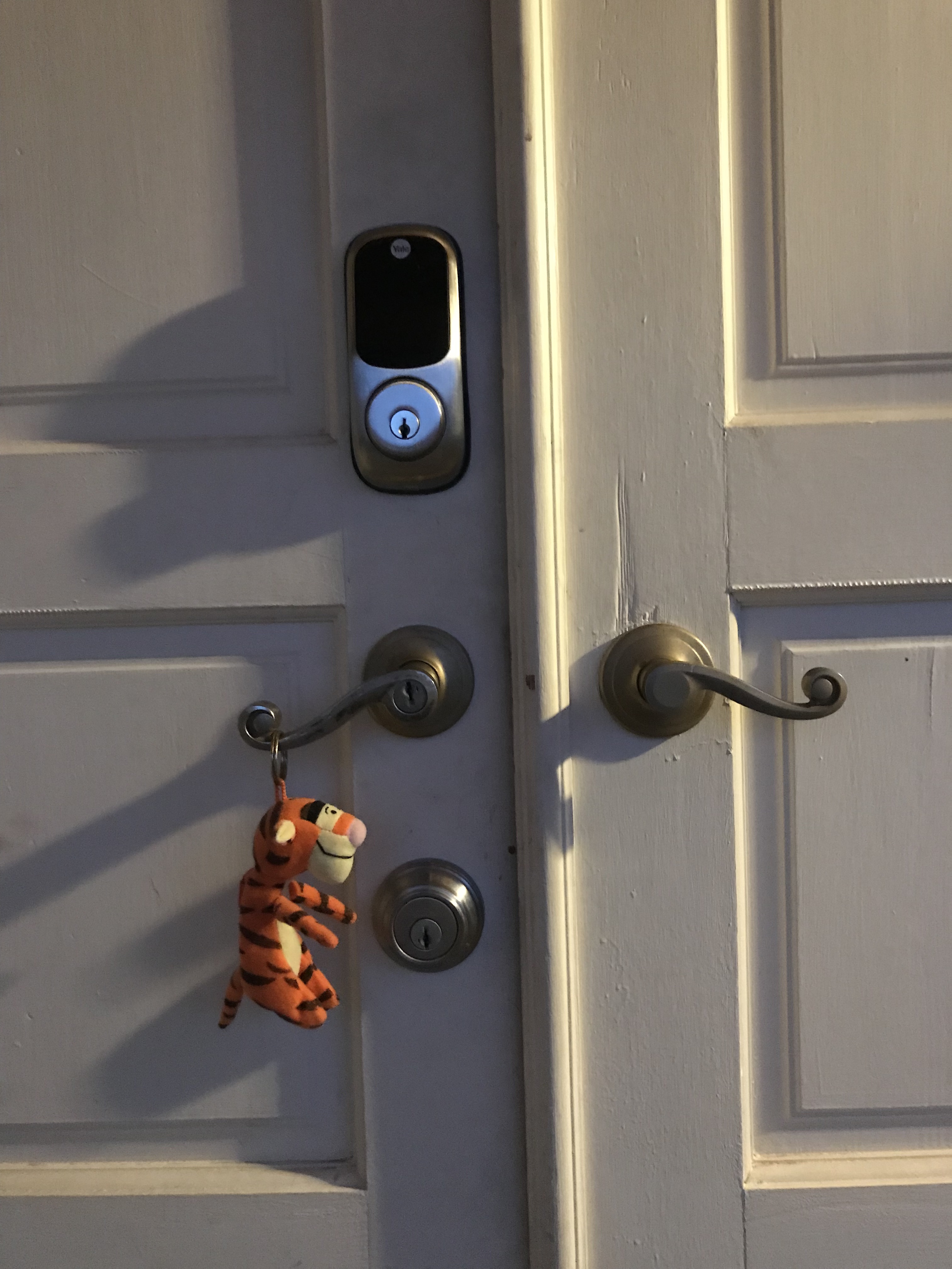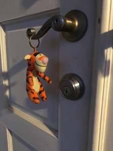 There is a small stuffed Tigger that hangs from a key chain that, lately, can be found hanging on our door.