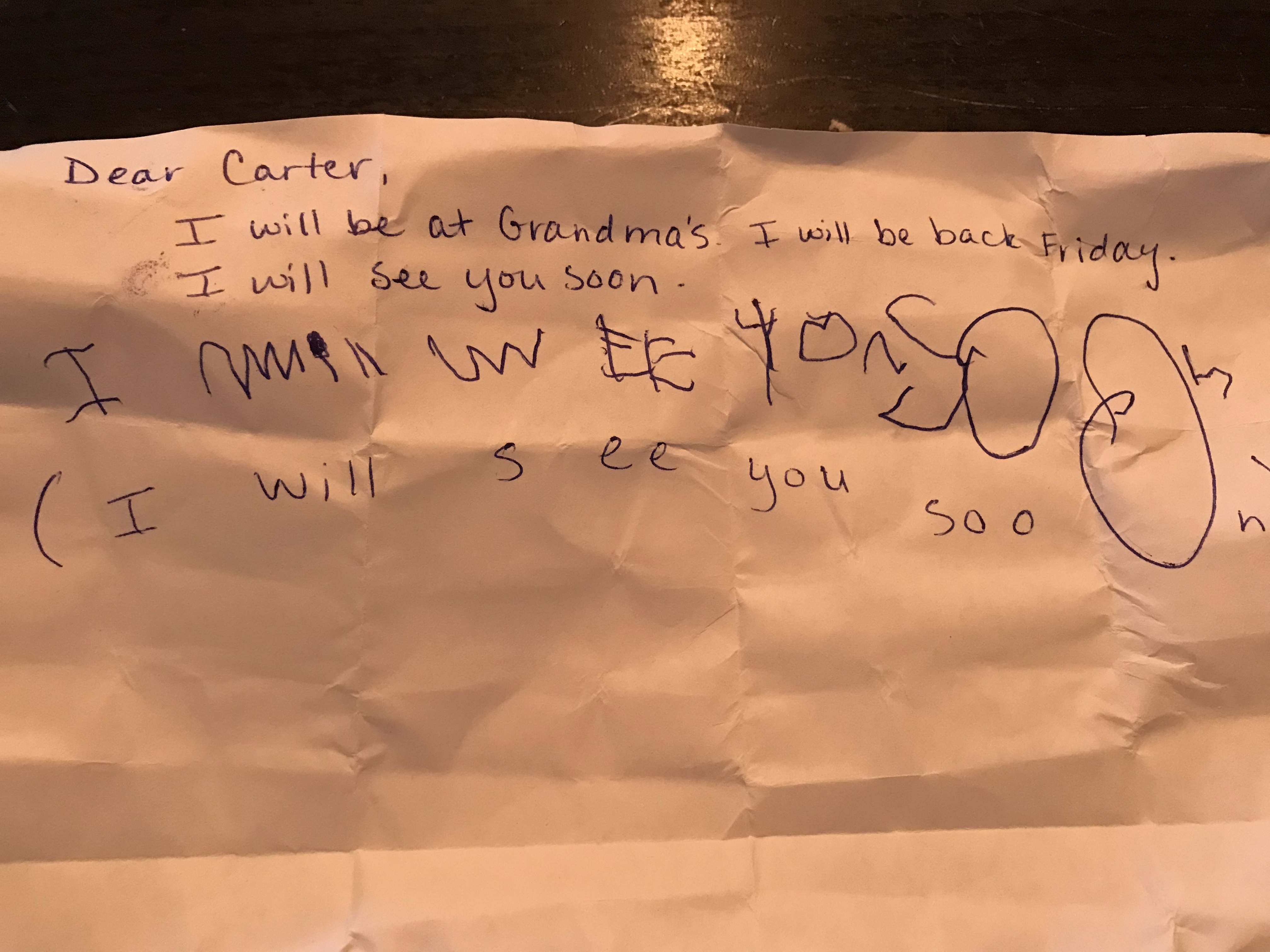 Ella will be 5 this summer and cannot yet write, but her mom acted as scribe for her. It was a simple note letting Carter know she will not be able to play because she is at her cousins house.