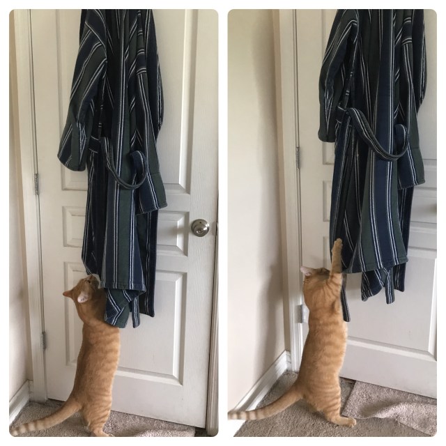 The other day I caught our orange cat, James, hanging on Husband’s robe. At the time of the robe hanging, the robe was itself hanging on the back of our bedroom door and, thankfully, not hanging on Husband.