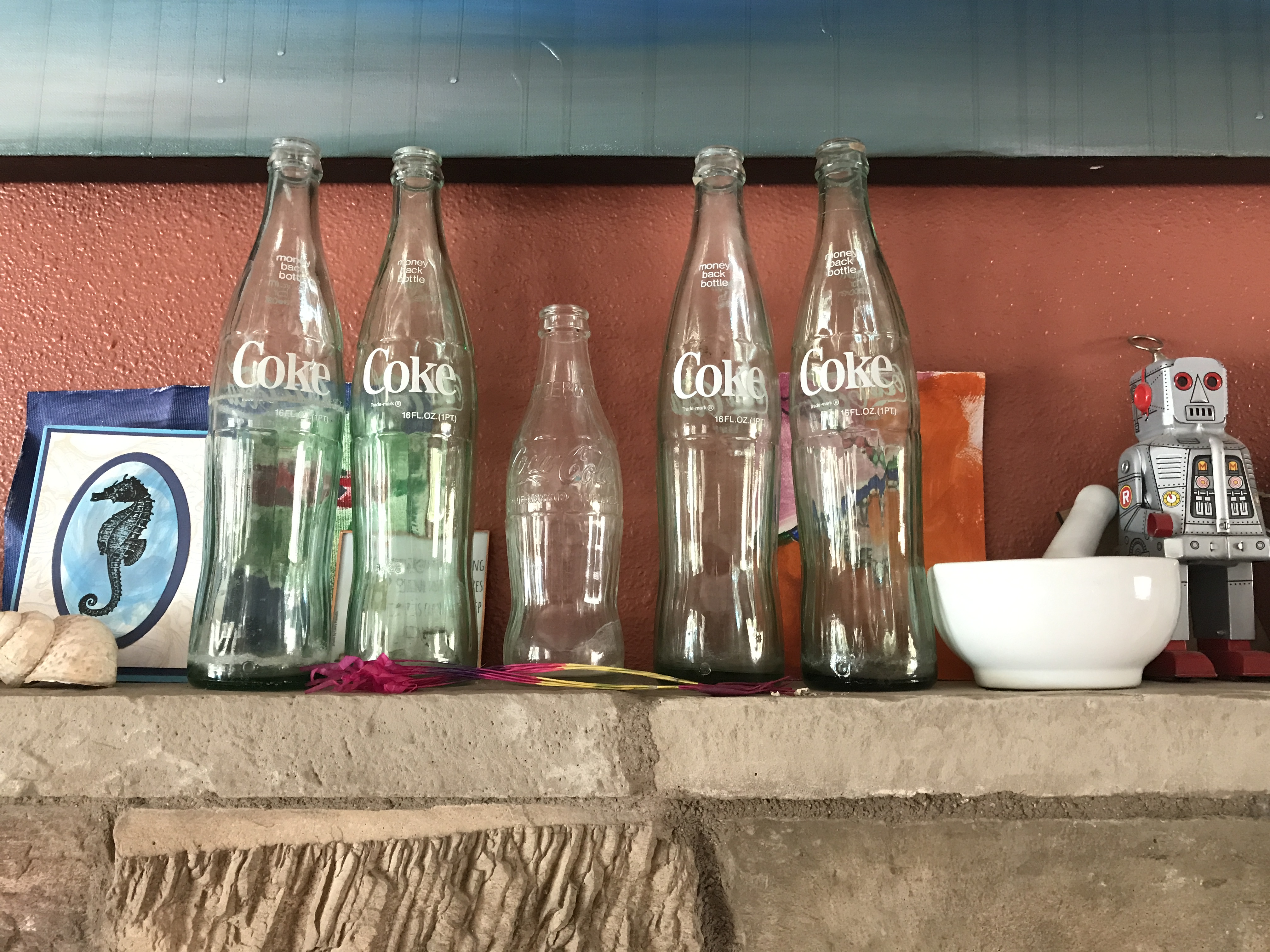 The four larger bottles had printed on them a city and state. I put them up on our slightly crowded mantle.