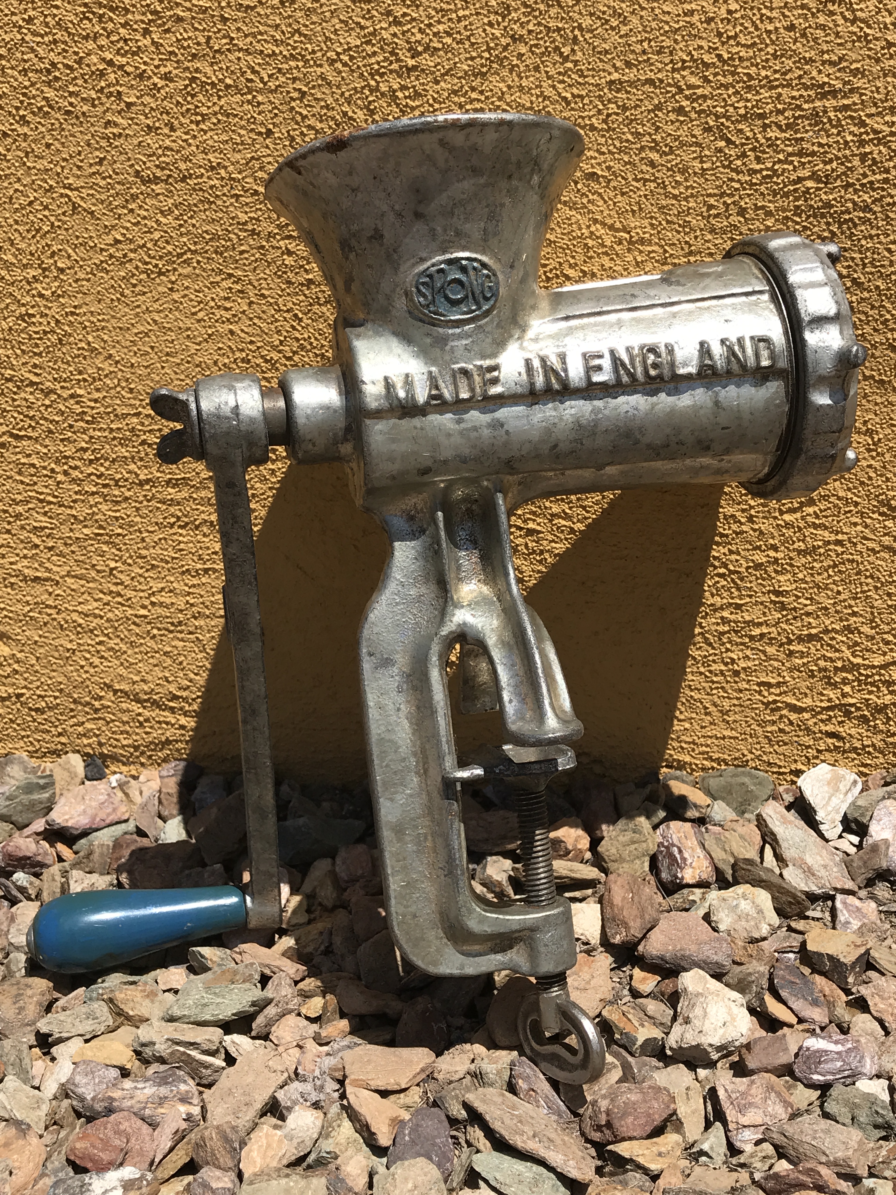 I thought the meat grinder would look nice clamped to the side of the mantle, but I fear the mantle would crumble under the grip of the clamp and weight of the grinder. Plus Husband worried that I might get all Carole Baskin on him the next time the topic of our garage came up. This gem is still in said garage.