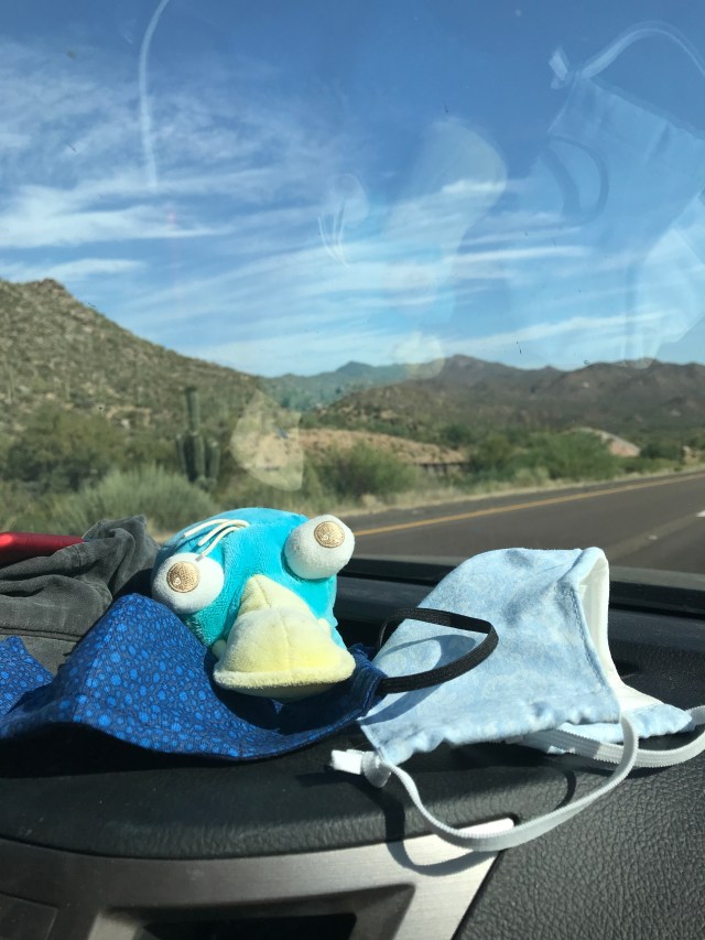 Perry the Platypus, ever our road trippin’ companion nestled into the nest of masks on the dashboard, a inadvertent reminder of why we needed this trip.