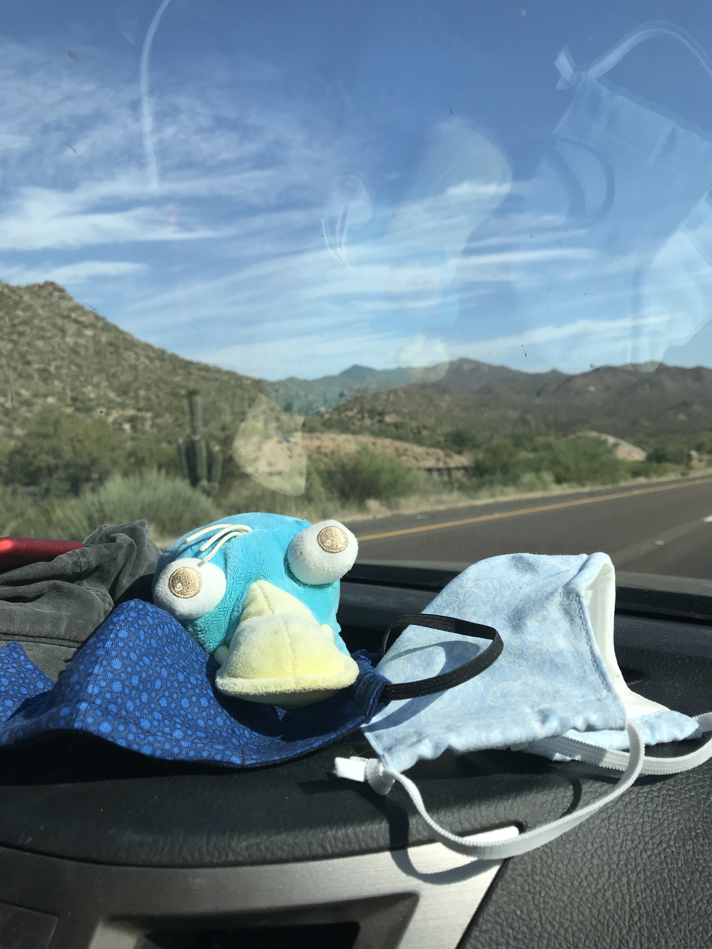 Perry the Platypus, ever our road trippin’ companion nestled into the nest of masks on the dashboard, a inadvertent reminder of why we needed this trip.