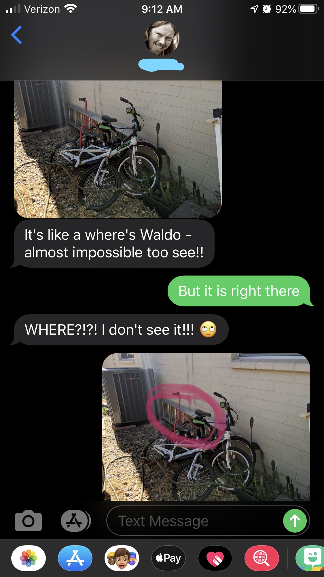 I am inside in air conditioning, working hard on something productive, I’m sure, when I receive a text from him that he has found the missing ladder. He sends picture proof resulting in this text thread: