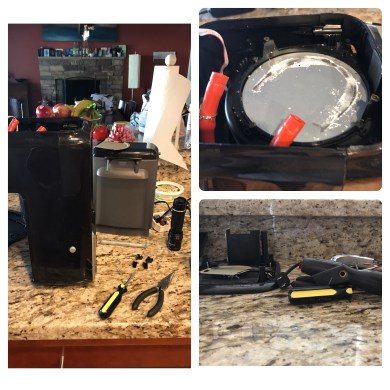 Undeterred, Husband proceeded to perform a multi-organ transplant, removing the bad  heating element and all the parts and pieces that went along with it and replaced it with all the inner workings from the coffeemaker with the missing face plate. This was very stressful because what if something went wrong? Would we have to use our back-up coffeemaker thereby no longer having a back-up coffeemaker? You could imagine the stress. But there was no need to worry.