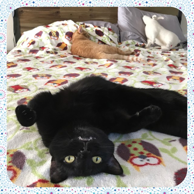 Leia (short for Princess Leia) – quirky, petite, and often aloof. Likes to be held when her humans are trying to cook dinner or do laundry. Seen here with a sleeping James and Goat.
