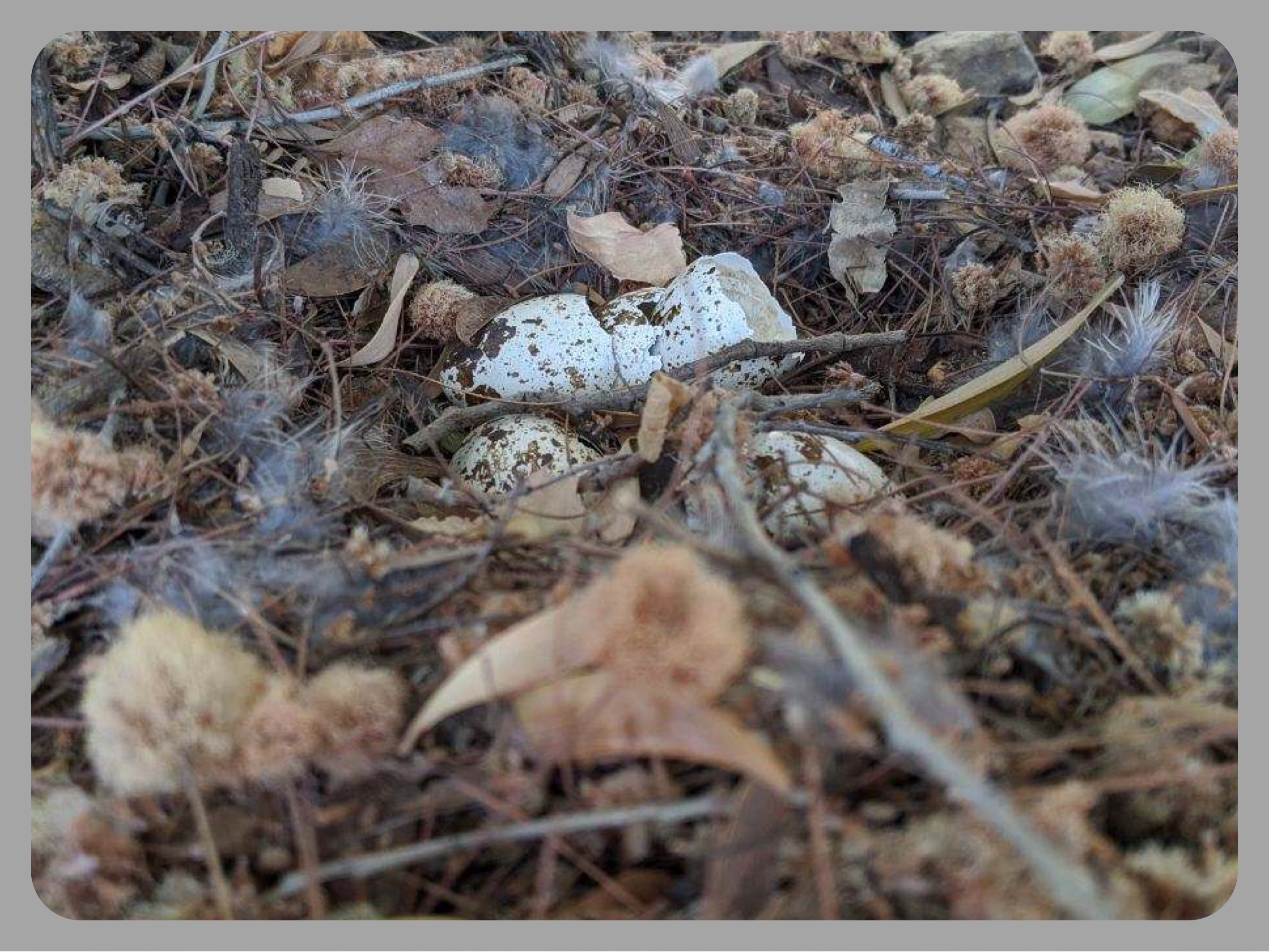Feather fluff of quail and empty shells remains.