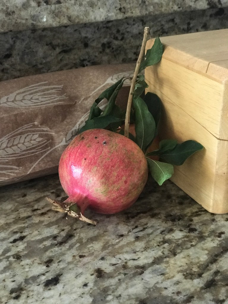 According to several gardening sites, the “Wonderful” variety of pomegranate is the most common and most prolific bearer of fruit in Arizona and California. Carter came home with this, picked from our neighbor’s yard (with permission, of course). I thought it very pretty sitting there on our counter.