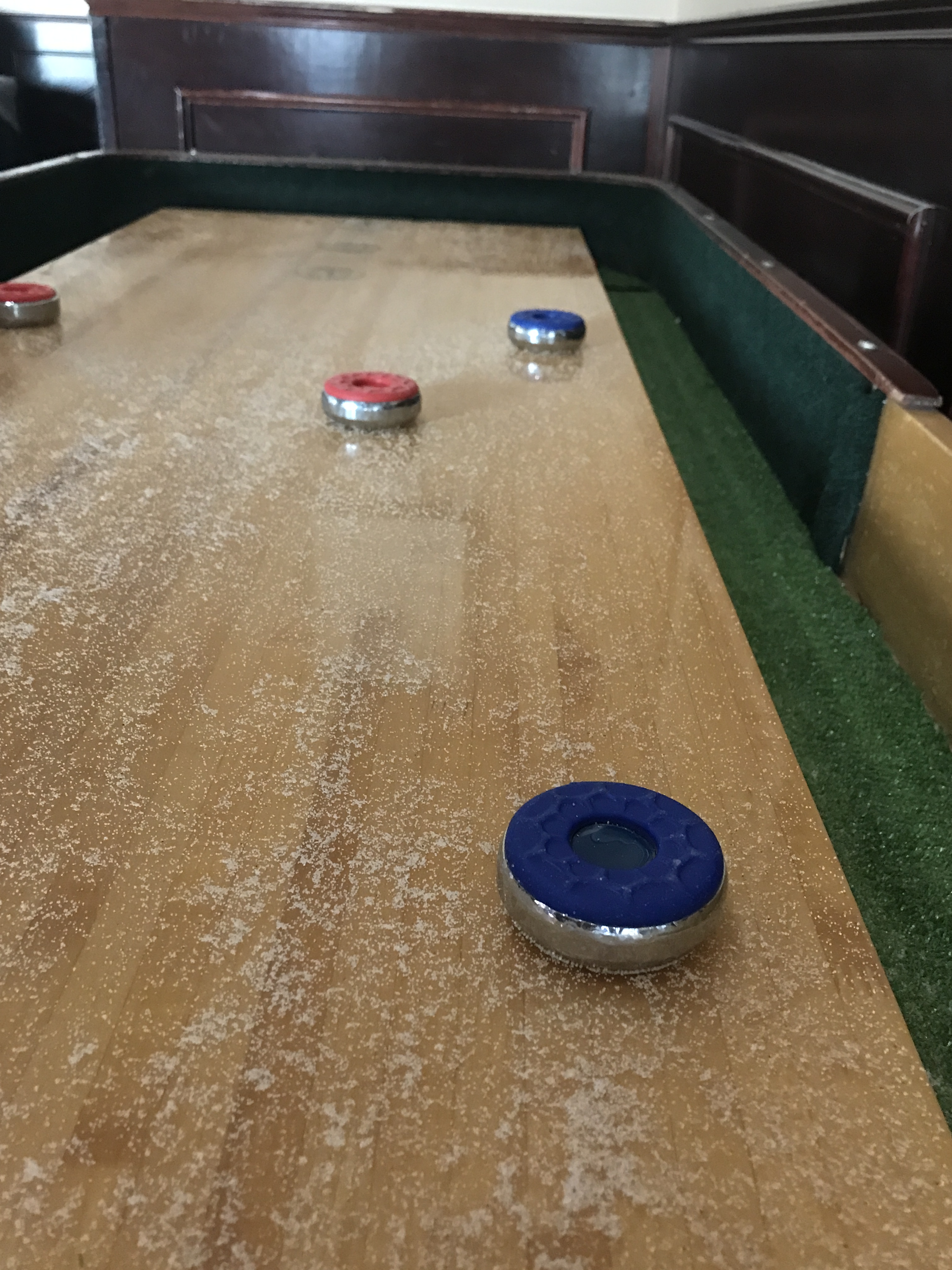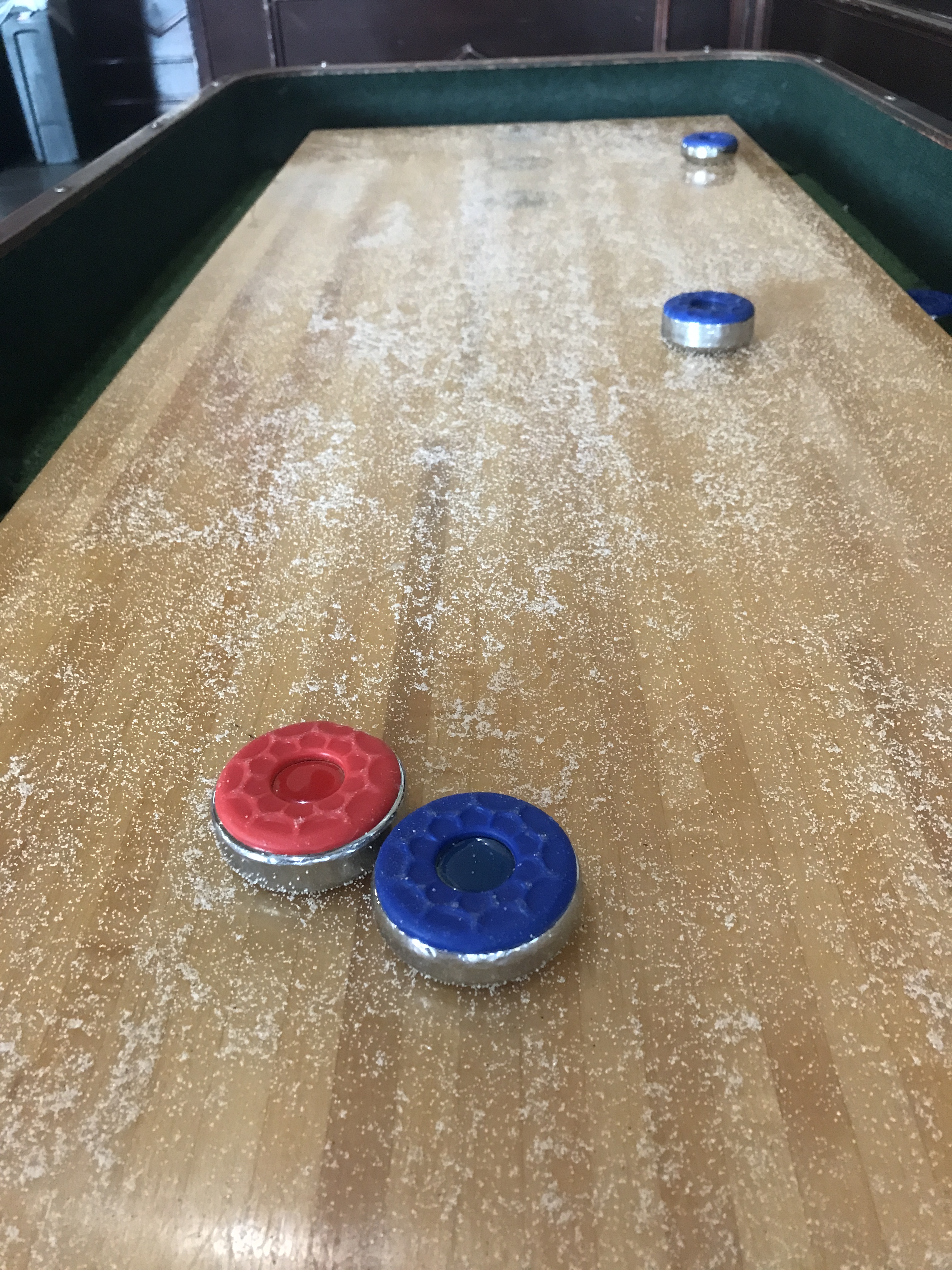 No one was there. It was glorious! Being frugal and still feeling the shock of the “deal” we used and then some to load up the boys’ game cards, we did not want to actually pay to play pool, but as luck would have it, there was a shuffle board along the far wall. All six pucks were quietly sitting there. Waiting for us.