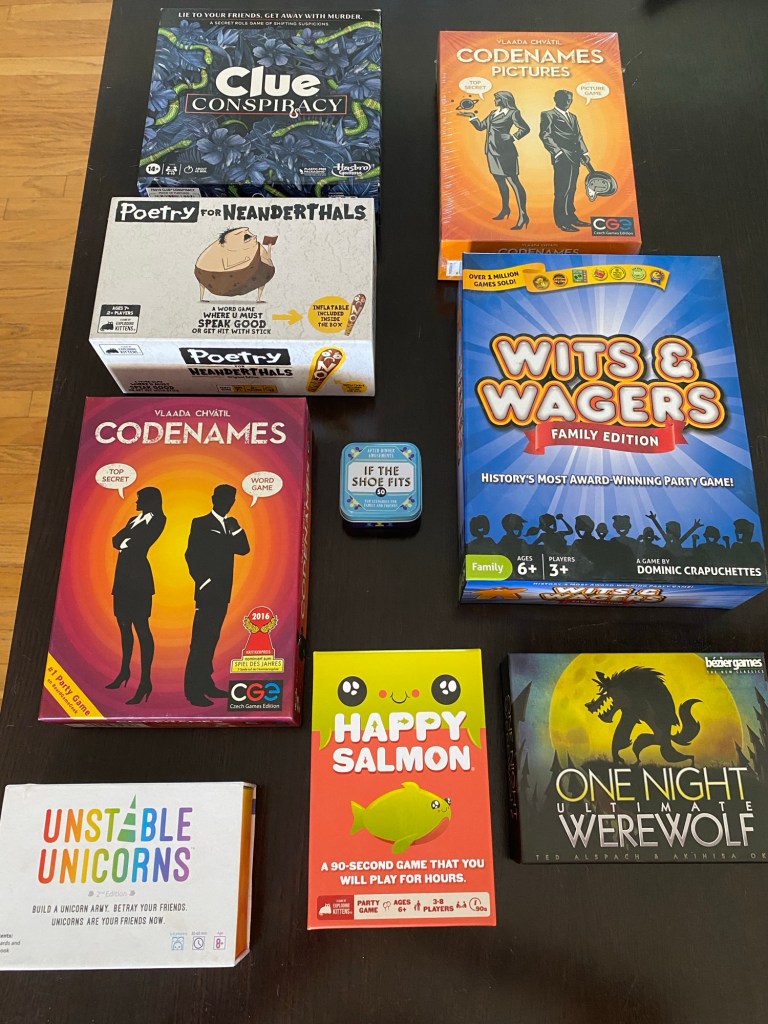 We are having a few friends over for a board game afternoon. After sorting through our game cabinet and pulling out games that can have eight or more players and does not take hours to learn how to play, these are the ones I’ve selected. I still need to narrow it down, of course, but it is a start. Any suggestions?