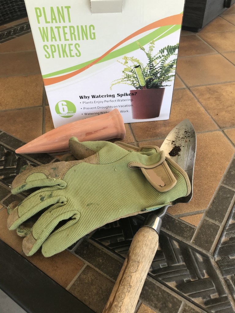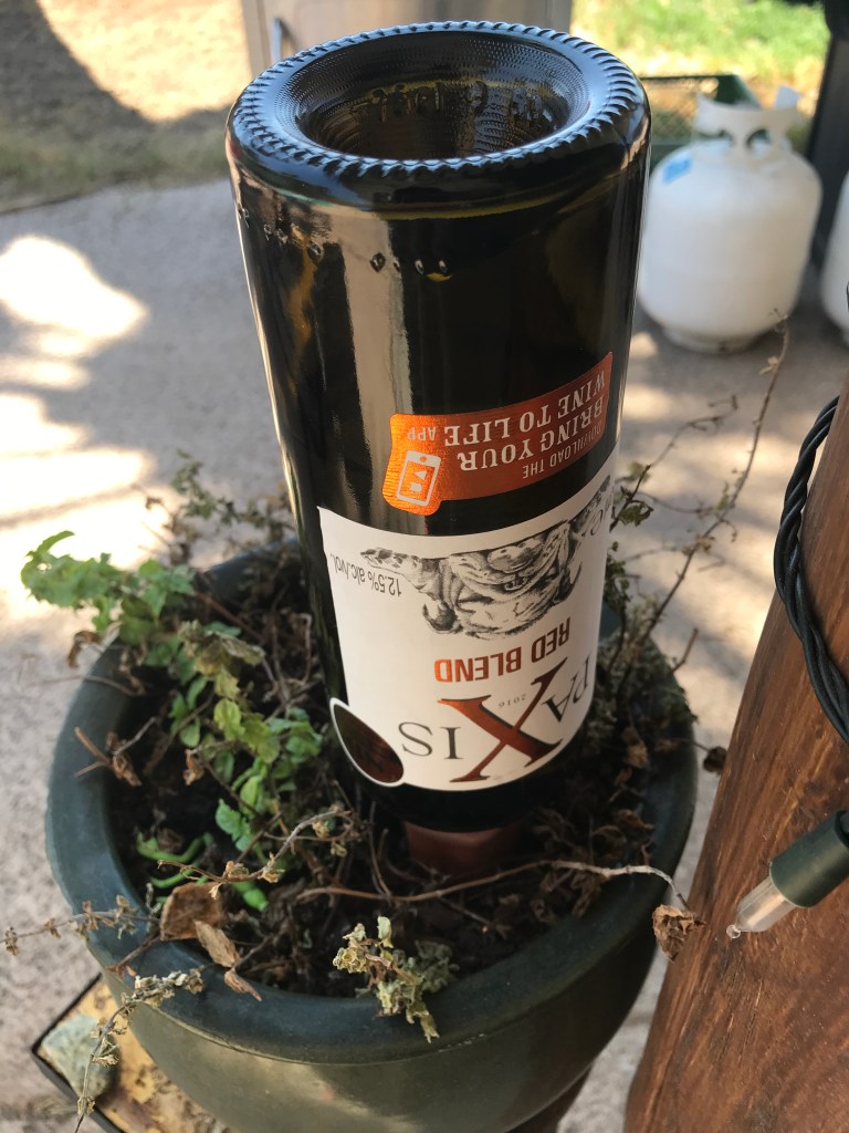 I have never used these before, but the reviews were good and it gave us a reason to drink an extra couple bottles of wine. Basically, you use a longneck bottle, such as a wine bottle, filled with water tipped upside down in the porous ceramic spike. The spike will saturate and then diffuse the water based upon the wetness of the surrounding soil.